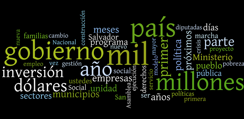 Así luce el discurso del presidente Mauricio Funes procesado con un programa de computadora que muestra las 50 palabras que con mayor frecuencia fueran citadas por el mandatario.