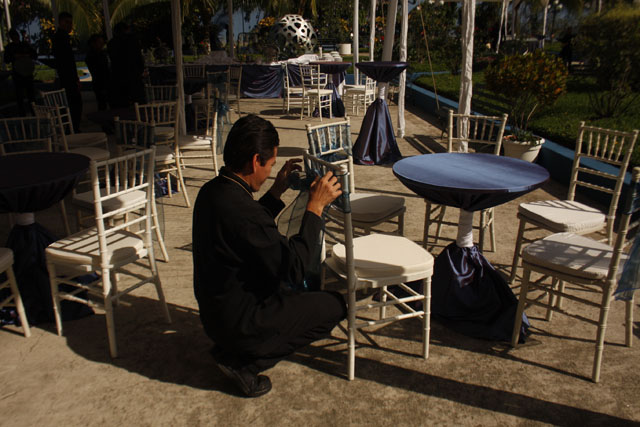 Un empleado pone a punto el lugar donde los diputados y los invitados especiales se dieron un banquete para celebrar la asunción de Reyes a la presidencia de la Asamblea.