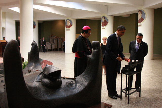 Obama prendió una vela ante la tumba de monseñor Óscar Romero, pero se abstuvo de hacer declaración alguna ante la prensa. Lo acompañaron el presidente Mauricio Funes y el arzobispo de San Salvador, monseñor José Luis Escobar Alas.